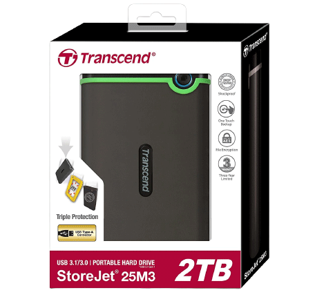 Built with a durable anti-shock rubber case, the iron grey 2TB(2000GB) USB 3.0 External Hard Drive from Transcend combines a 2TB(2000GB) storage capacity with a USB 3.0 interface, 256-bit AES file encryption, and military-grade shock resistance. The internal 2.5″ hard drive receives further protection from a suspension system, while a one-touch auto-backup button helps to create a second copy of your data and a quick reconnect button re-enables the removed hard drive without needing to remove and reinsert the USB cable. Power is provided via the USB bus, and compatible operating systems include Windows, Mac, and Linux.